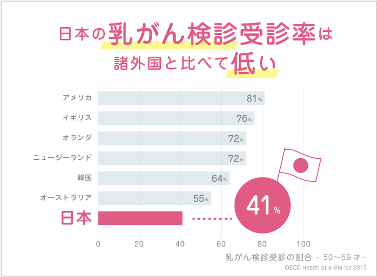 乳がん検診の受診率も欧米では70−80%であるのに対し、日本では40−50%と世界の先進諸国の中でもかなり低い水準になっています(文献8,9)。まだまだ多くの人が乳がんは他人事だと思っているのです。