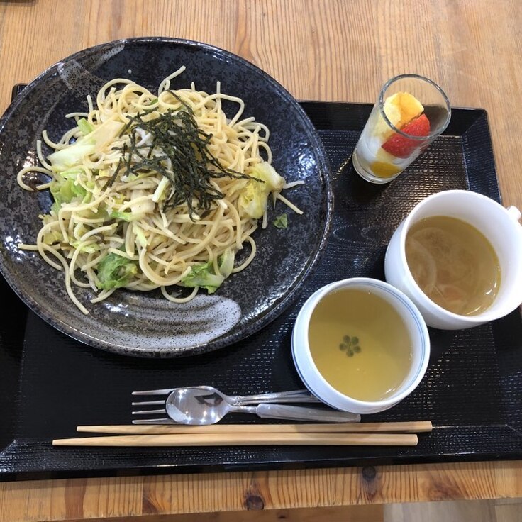 今日のメニューは和風スパゲッティ スープとデザート付きです。