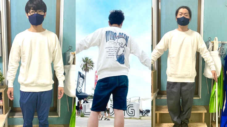 全国のアーティストの方々にデザインしていただいた、昔ながらの職人技で編まれた脇に縫い目がないスウェット。「4本針フラットシーマ」という特殊なミシンで縫製をしています。一年中愛用できる軽やかな着心地が特徴です。