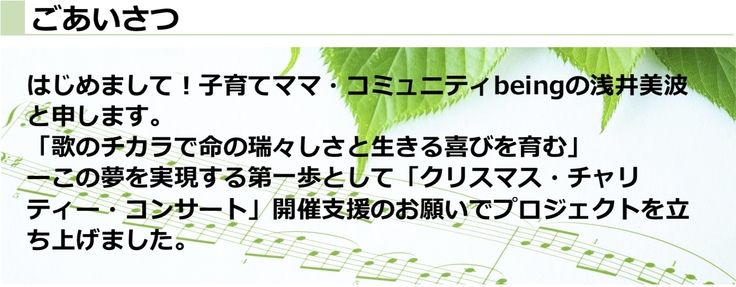 子育てママ・コミュニティbeingが12月17日(日)にクリスマス・チャリティー・コンサートを開催します。 集まった資金は音響費、照明費、宣伝広報費、会場装飾費、実行準備費に使用します。