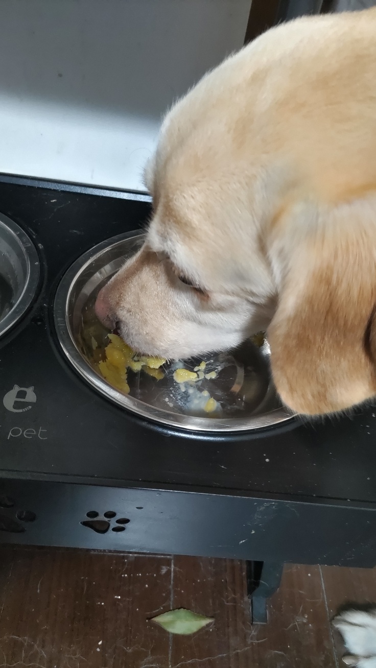 芋のペーストと最近お気に入りのワンちゃん用のコーンスープを混ぜたモノです。