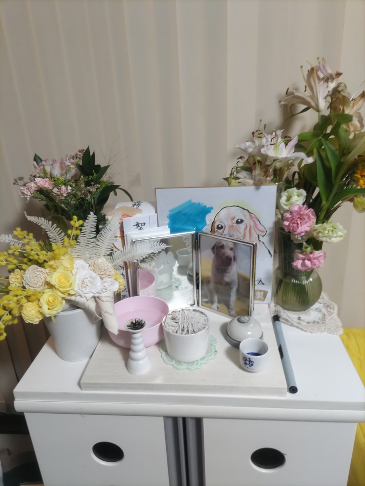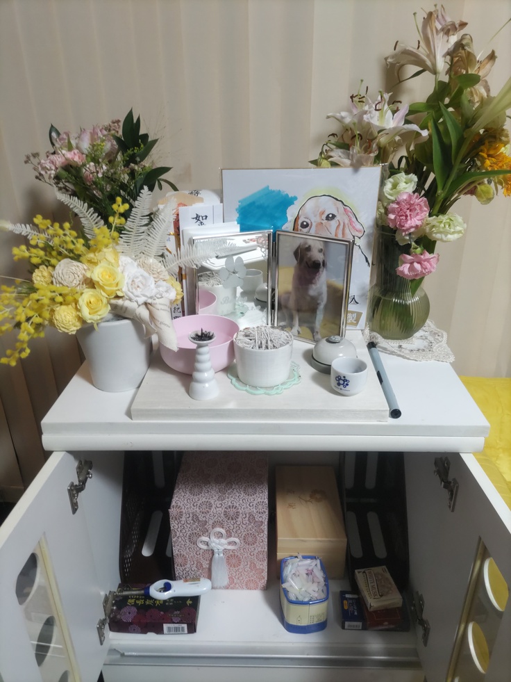 それから家族の意見で仏壇置き場が和室だとベイリーが寂しそう・・・という事でリビングに引っ越しました。リビングのいつもいた黄色いベンチの脇に置きました。仏壇の台も変えました。ちょっと体積大きいですが高さを出してまぁ問題ないです。上にのせた仏壇も新調しましたが・・・思ったより小さく・・・いろいろ置いたら何も見えませんが立てかけるにはばっちりです。先ほどの色紙もここに。