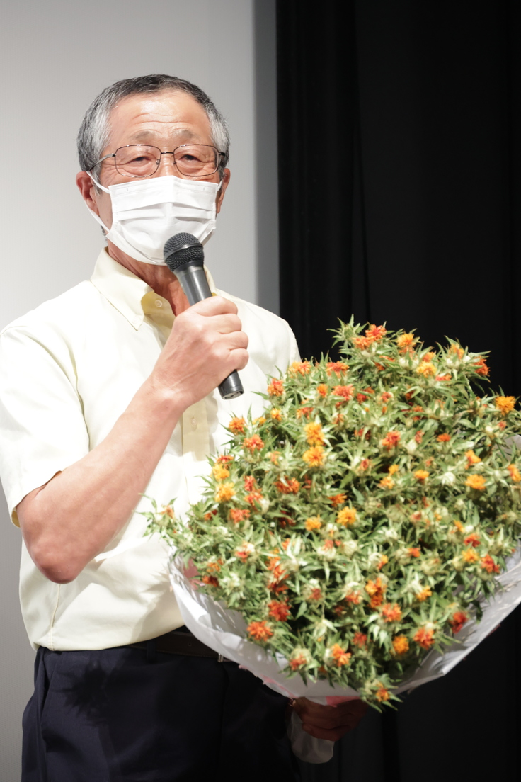 途中から紅花をもって登壇した長瀬さんが、「紅花の物語を、映画というかたちで多くの人に届くことに感謝しています。」と語ると。