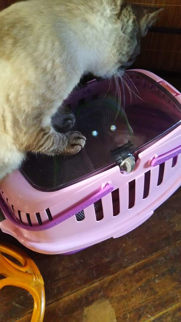 キャリーに入れられたきじたろう君を、まぁ君が心配そうに覗いていました。 まぁ君はとっても優しい子で、猫たちの「おにいちゃん」的存在です。人に甘えるのも大好きです。