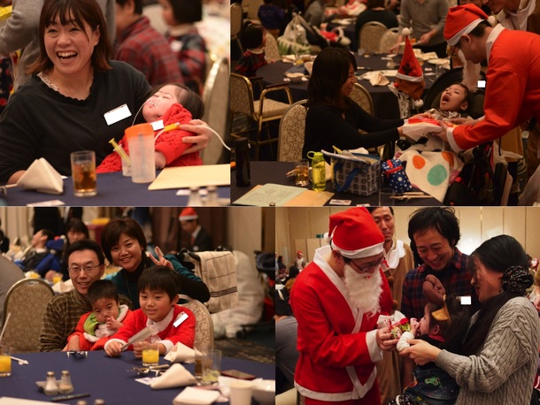 BFRスタッフが仕事の合間に集まって練習し撮影したブルゾンちえみwithBのパロディを上映し、会場が和やかな雰囲気になったところで、ビュッフェ形式のクリスマスランチを楽しみながらご家族同士で交流していただきました。はじめて参加されたご家族どうし、1年ぶりの再会で旧交を温め合うご家族たち、会場のいたるところで話の輪ができました。クリスマス会の中盤にはご家族の紹介コーナーとして、事前に送ってもらった家族写真とコメントをスライドショーに編集して流しました。そこには医療的ケアがありながらも旅行に行った様子、七五三のお参りの様子、家の中での一コマ、などがほほえましく映し出され、心がほっこりする時間になりました。その後、サンタとトナカイに扮した理事長たちがクリスマスプレゼントを持って子どもたちのもとをまわりました。