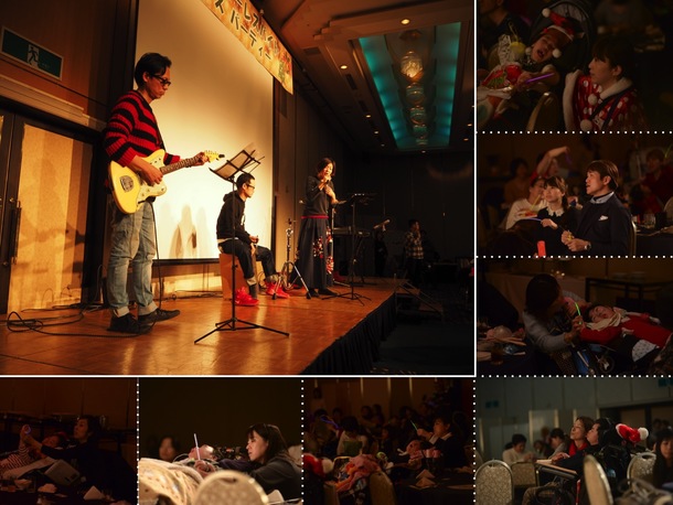 最後は、医療的ケアのある児の2家族でバンドを結成して活動されている「ムジグル」さんのミニクリスマスコンサートを行い、心にしみる歌声と演奏にうっとり聞き惚れ、最後はペンライトをかざしながら全員できよしこのよるを歌ってお別れしました。参加者からのアンケートでも、「普段外出しにくい中、家族でクリスマス気分を味わえた」「家族で楽しく思い出に残るクリスマスを過ごせた」「子どもも大人も楽しく美味しく過ごせた」など、参加者全員が楽しめるクリスマス会にすることができたと思います。