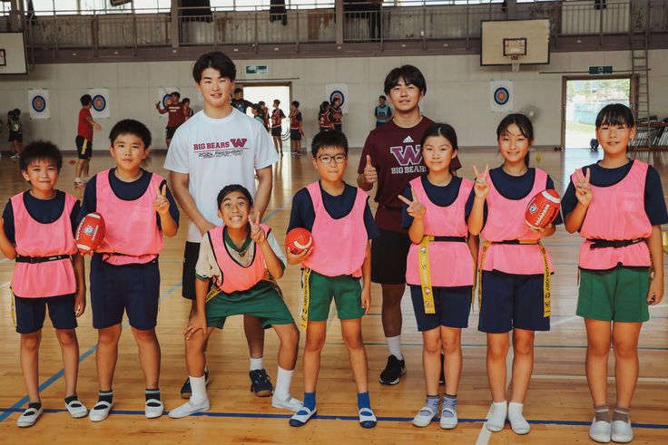 いわき市立平第三小学校では、児童の皆さんと一緒にフラッグフットボールを楽しみました。また、給食を共にする時間もあり、さらに交流を深めることができました。