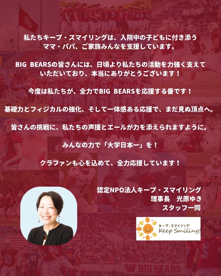 弊部がボランティア活動の一環としてご支援させていただいている認定NPO法人 キープ・スマイリング 理事長 光原様より、現在進行中のクラウドファンディングへの温かい応援メッセージをいただきました。