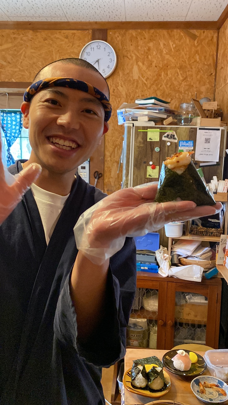 おにぎり君がにぎる、エネルギーがこもったおむすびとガーリックが効いたエビはもちろん、、