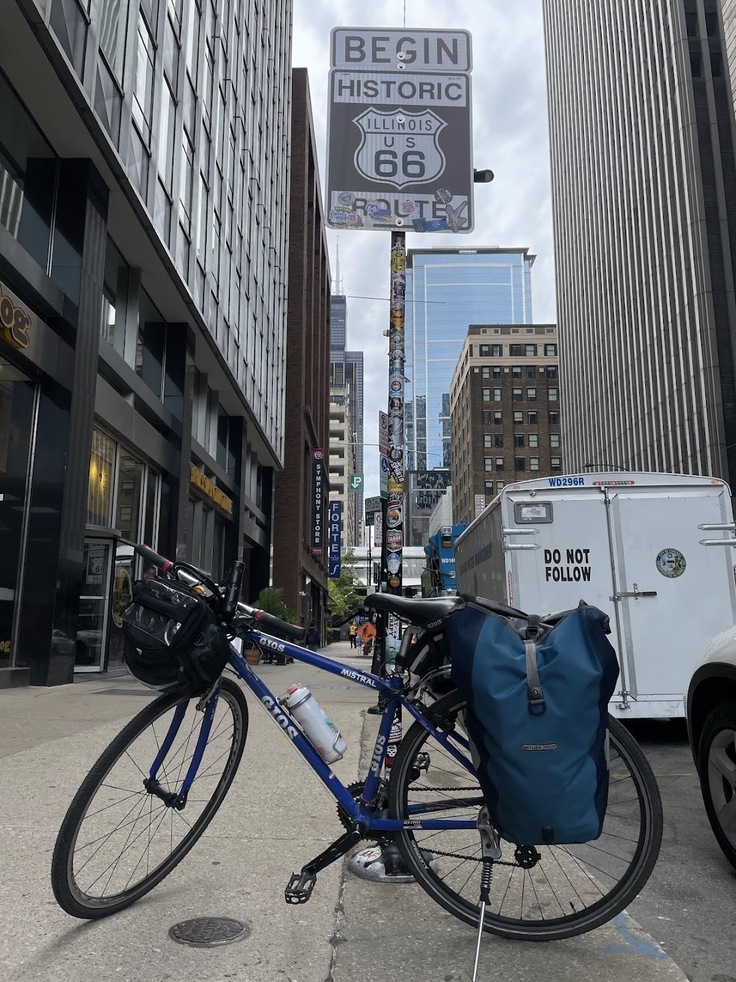最後は、ミシガン湖から吹く冷たい向かい風に苦しみながら、ようやくゴール地点のグラントパークへ到着。R66マークはほとんど見かけなくなり、観光地としての「R66推し」はほとんどなし。サンタモニカのような観光色とは対照的でした。