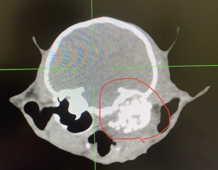 さらにCT検査で詳しく調べたところ、左耳の付け根の骨は骨折で粉々になっており、平衡感覚や聴覚、視力、お顔を動かす神経などをも巻き込んでぐちゃぐちゃに壊れているような状態でした。