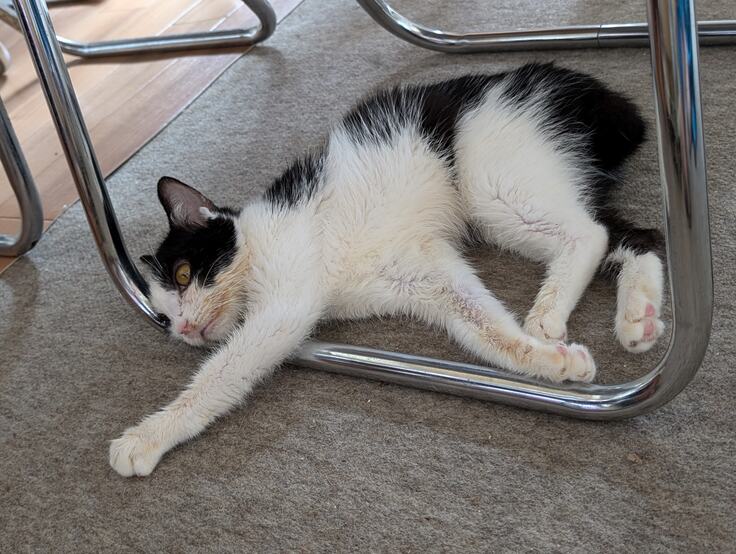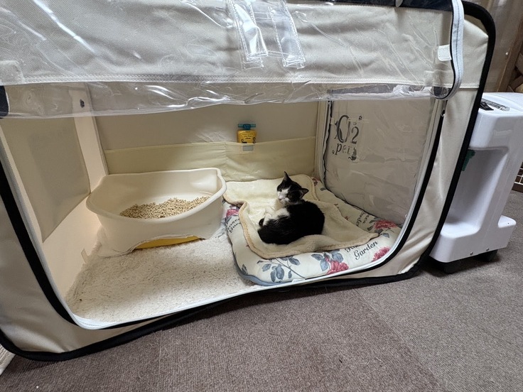 代表宅には天ちゃんのように、いつ何があるか分からない療養の必要な猫や、ハイシニアの猫がたくさん暮らしています。みんながそのコらしくその猫生を全うできるよう、お世話を続けています。また、ペット用の高濃度酸素発生器を年間リースしており、てんかん発作の天ちゃんのためにソフトタイプの酸素室も準備しました。