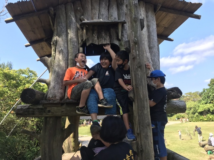 いい天気の中園内遊御庭近くのツリーハウスで楽しく遊んでいます。