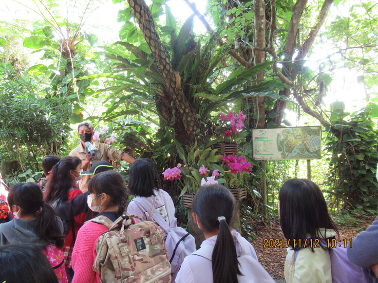 園内ガイドがハンドマイクにて植物の話をしながら案内中。