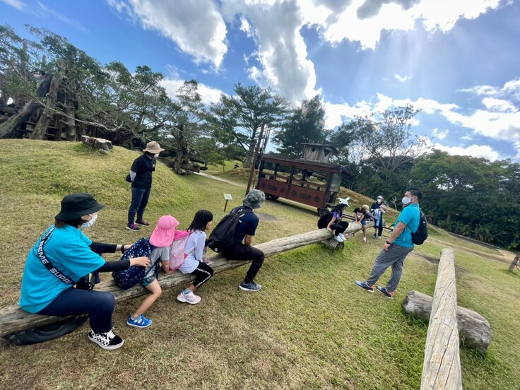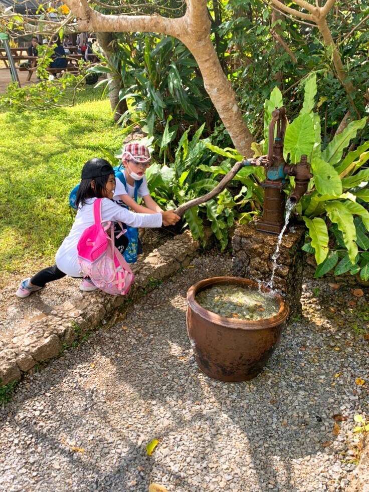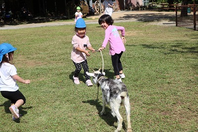 園内、遊御庭(あしびうなー)にいる島ヤギのリードを持って