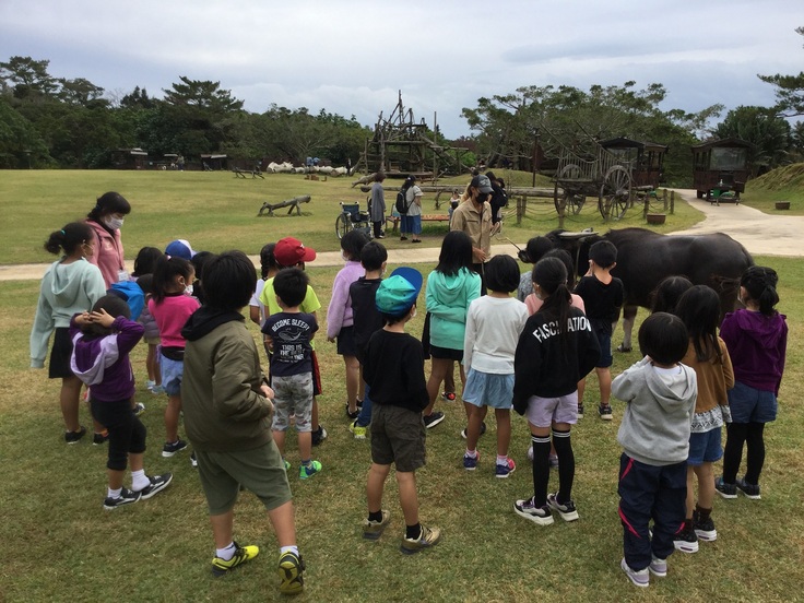 園内の水牛を生徒の前でお披露目し、水牛の名前と名前の由来。エサの種類や量、