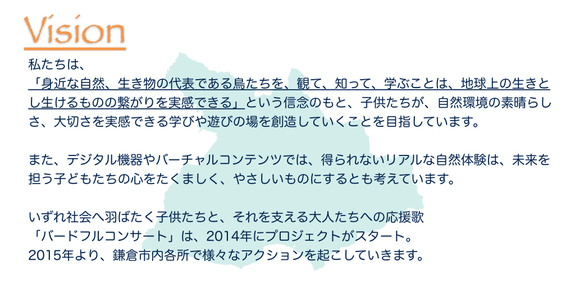 ホールのなかでの開催のコンサートと言う形から、もっと自然との接点の多い愛鳥イベントをコンサートの他にも多数企画していくことで子供達への鳥への理解、鳥との接触の機会を多く作り、愛すべき鳥たちも自然環境の元で生かされていると言う事を少しでも学んで欲しいと思っています。