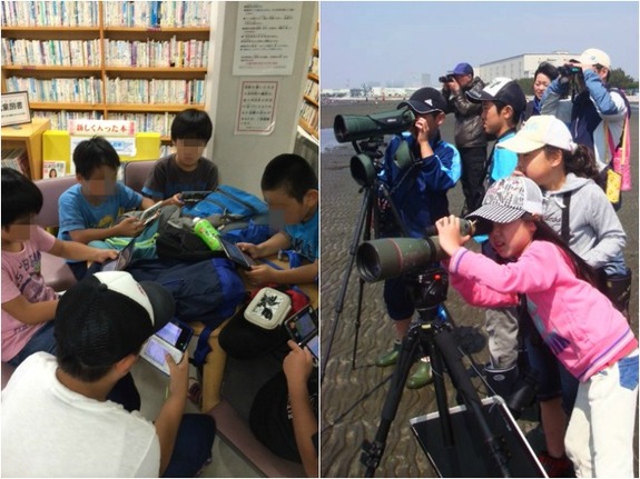 (左:ゲームに没頭する子供/右:野外で野鳥観察を楽しむ子供)