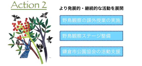 イベントを通して得たノウハウと利益をもとに、鎌倉市内の小学生を対象に、野鳥観察の課外授業の実施、鎌倉市内の探鳥ポイント源氏山等を中心に探鳥観察ポイントの整備、鎌倉市公園協会の活動支援を実施します。