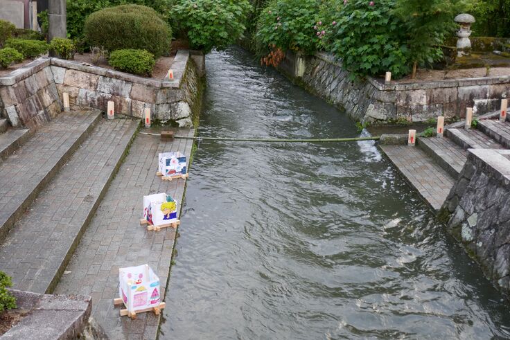 写真:地域の子供たちが作った灯篭。その思いを川に託す。
