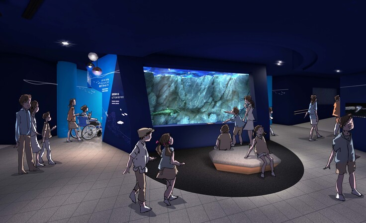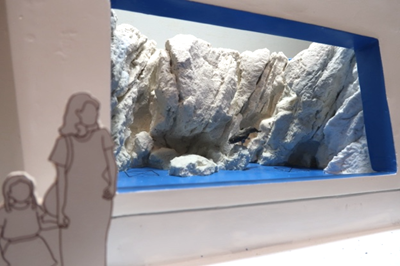 これまでのビワコオオナマズ・コアユ水槽は、どちらも大きな円柱型をしていました。円柱水槽は、見た目が幻想的です。しかし今回のような事故が起きると、大規模な被害をもたらします。また、同様の水槽にする場合、同じ大きさ・形の水槽は搬入できないことや円柱は中に入っている魚の姿が少しいびつに見えてしまう、複数匹飼うとケンカするという問題がありました。そこで、新しい水槽では、広い窓部分から伝説のナマズ岩にたたずむ「琵琶湖の主(ヌシ)」を見る形にしました。また通路の頭上から水槽をのぞき、ナマズたちを腹部側から見ることができる構造にしました。