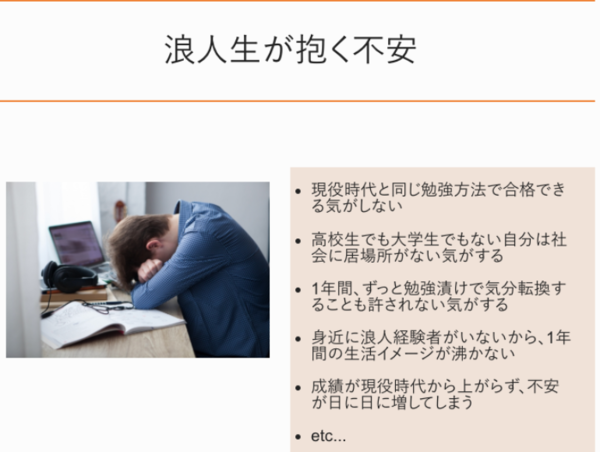 ・現役時代に不合格になってしまうと失敗体験が邪魔をし、浪人しても不合格になってしまうのではないかという不安がどうしても生じてしまいます。しかし自分と同じ境遇だったメンターの成功談を聞くことで、自分も合格できる可能性はあると思えるようになり、不安を強い希望へと変換できます。
