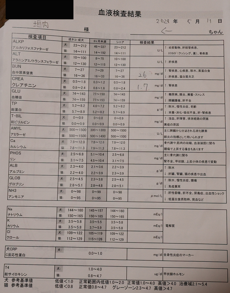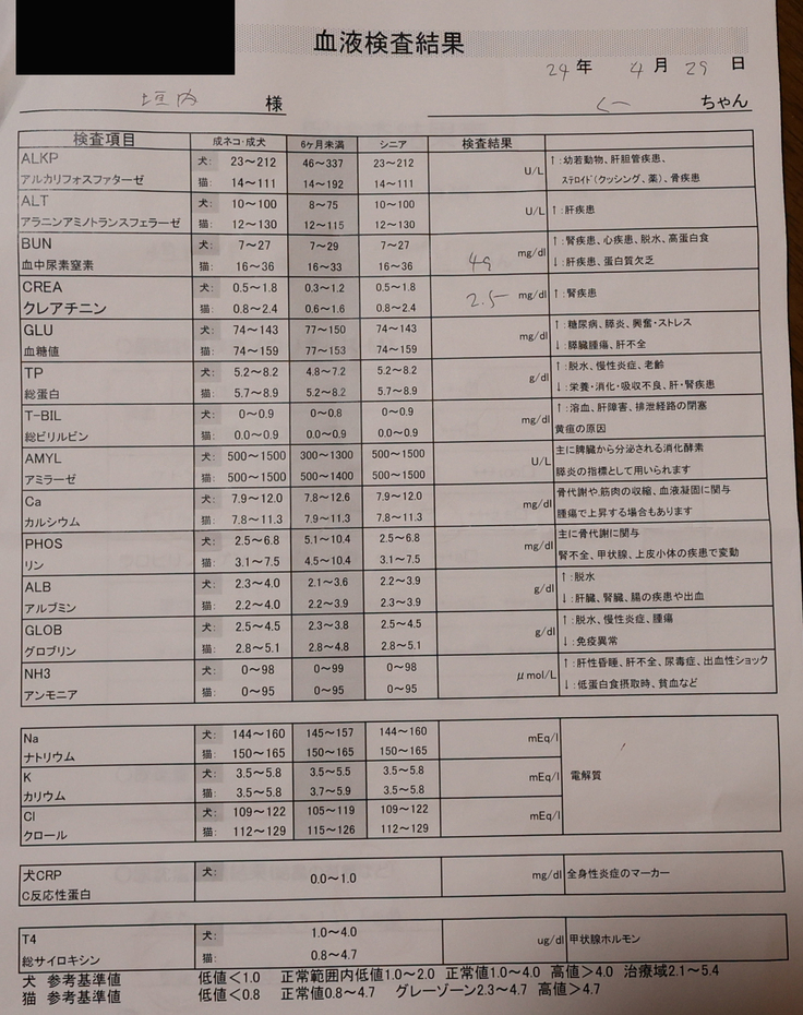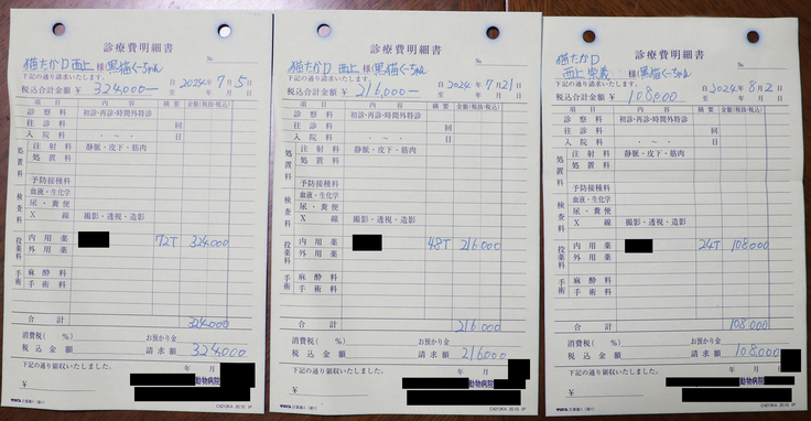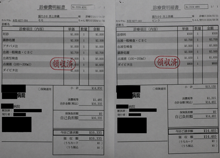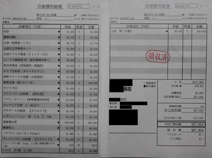 上記はくーちゃん輸血時のドナー猫の領収書です。