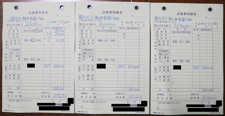 黒猫くーちゃんの喉の手術入院費97894円+原因不明の貧血、腎不全の治療入院費325278円