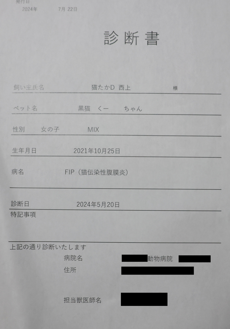 基本自費で賄っていますので、正直今回のFIP治療は苦しいです。