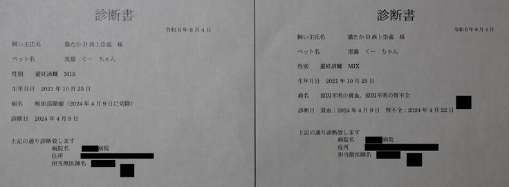 ページ上に掲載している診断書や診療明細書などの資料は全て動物病院から掲載の許諾を得ております。