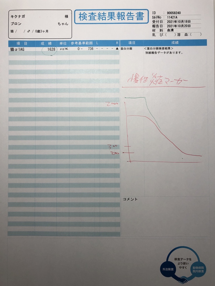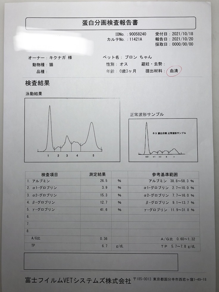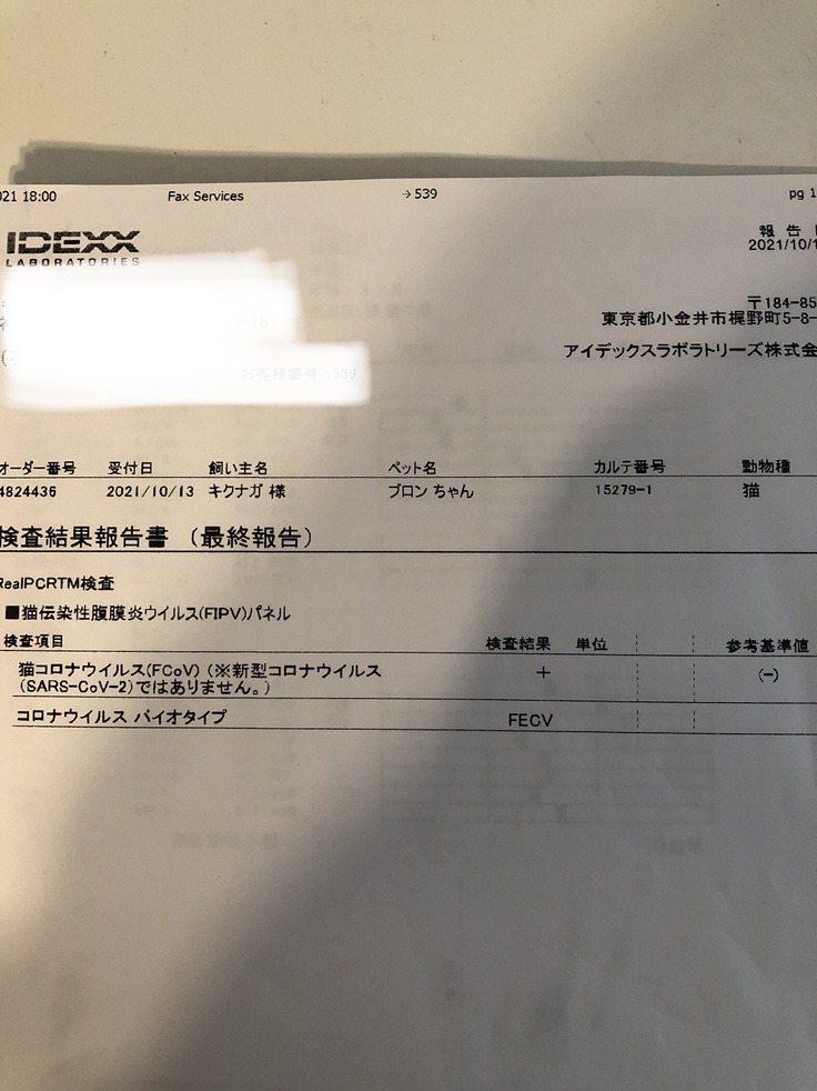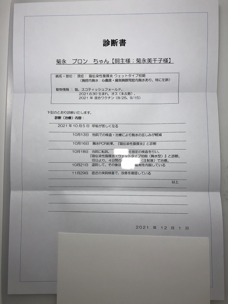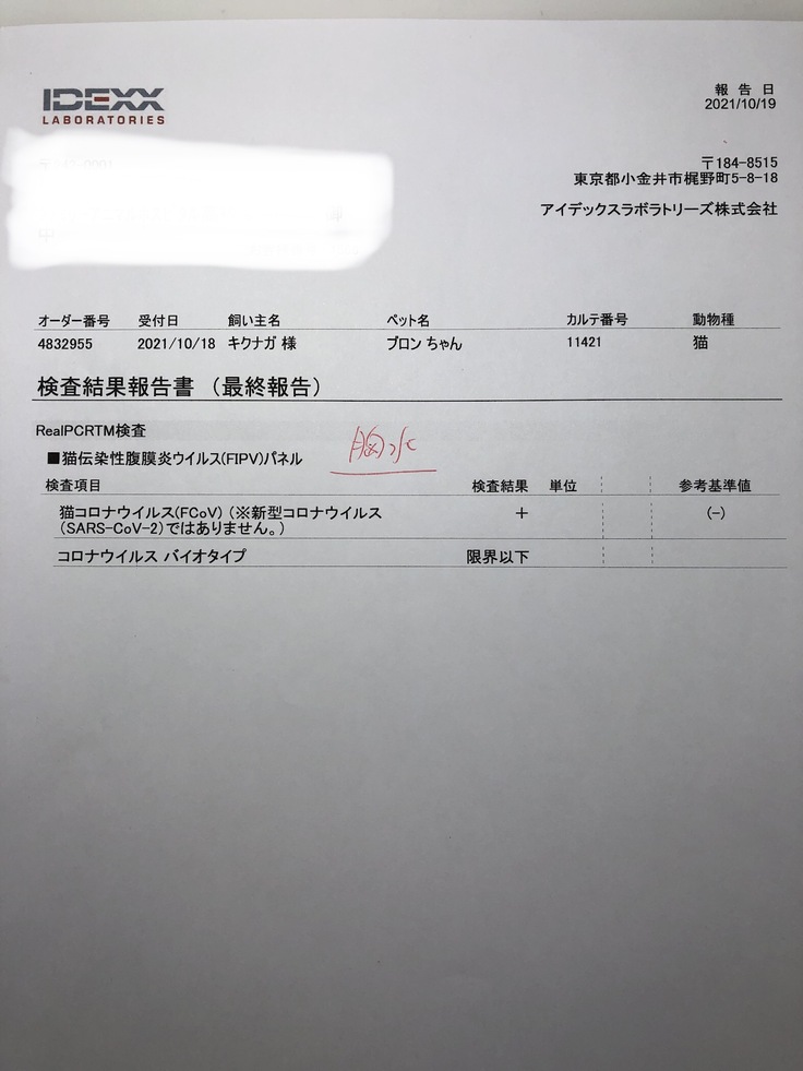 10月16日 検査の結果、猫伝染性腹膜炎(FIP)の可能性があると告げられる。