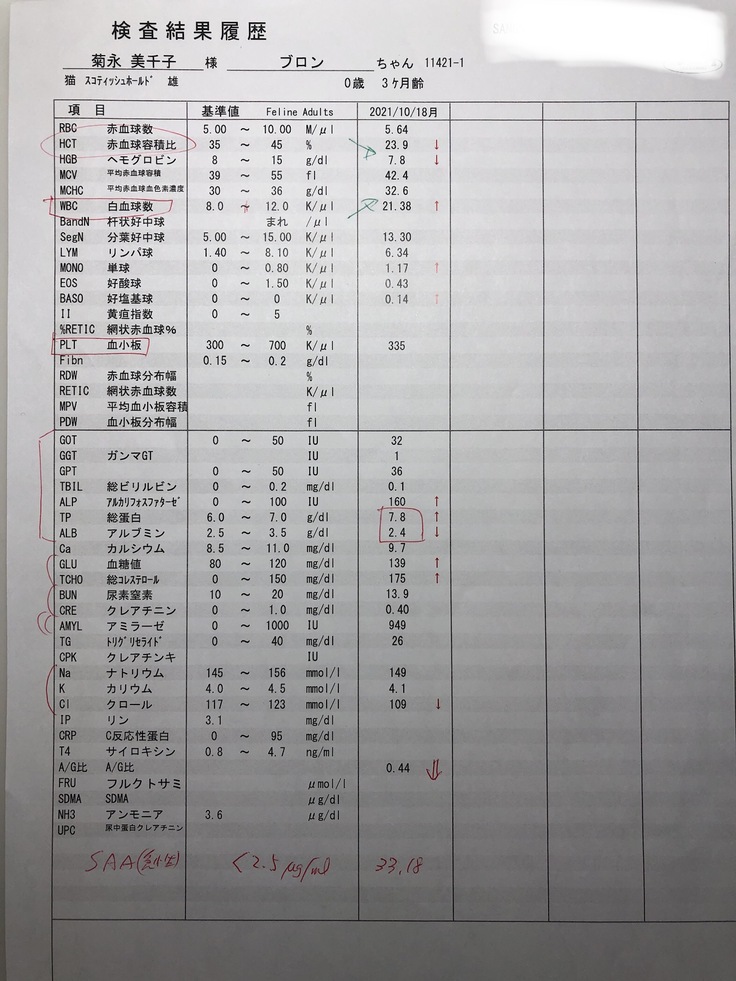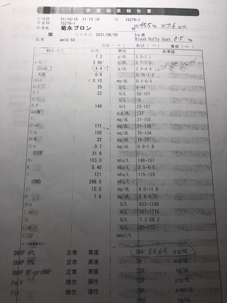 血液検査の結果:Glob 4.4 高値、 SAA 53.9 高値、HCT 23.5% 低値
