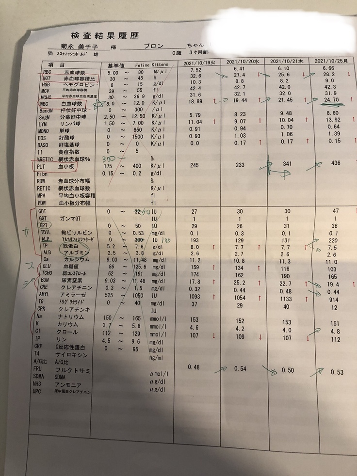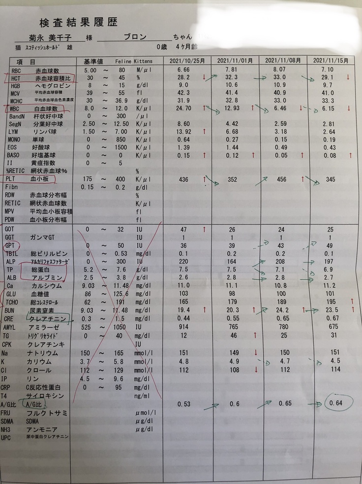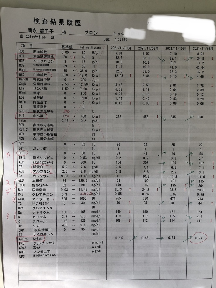 血液検査 赤血球容積比 32.5↑、白血球数 12.93↓、A/G比 0.6に上昇!(目標0.7)