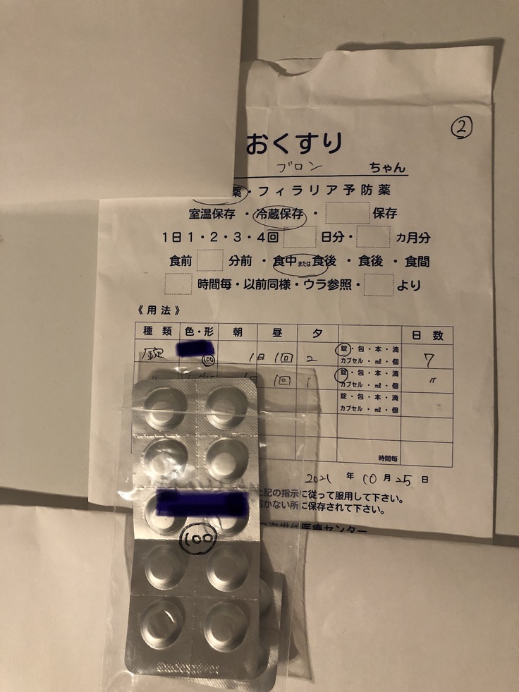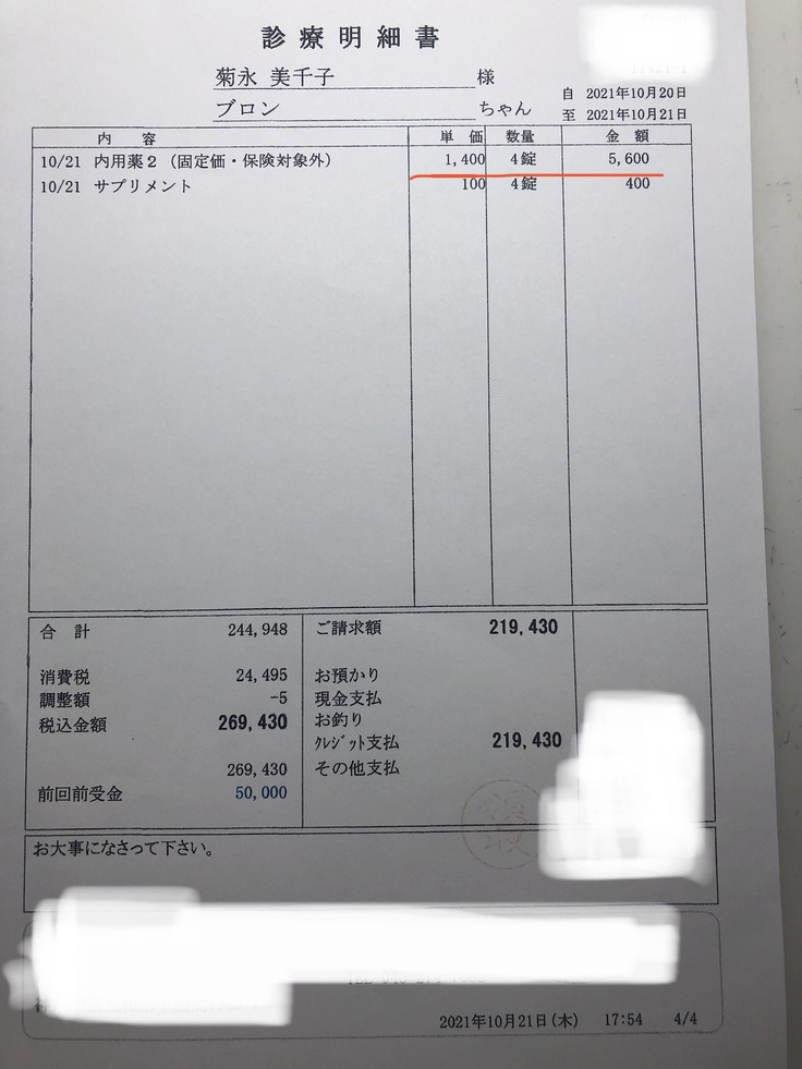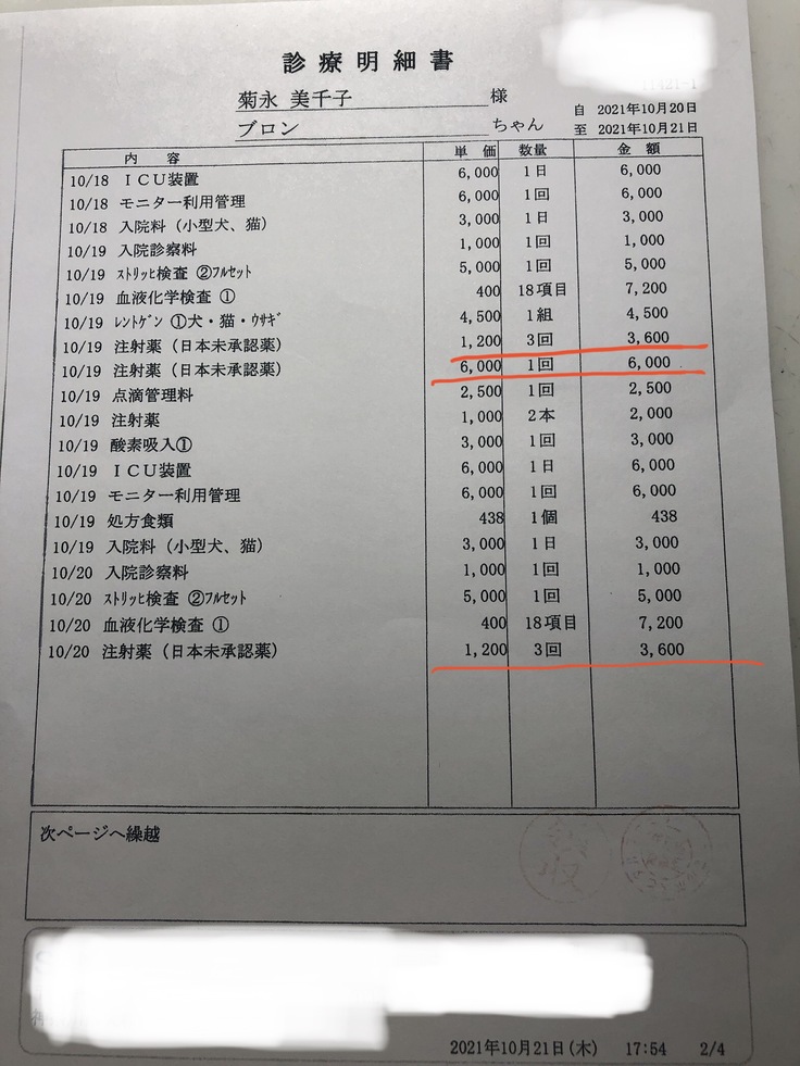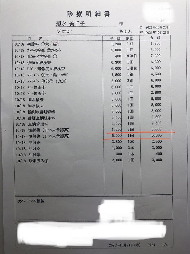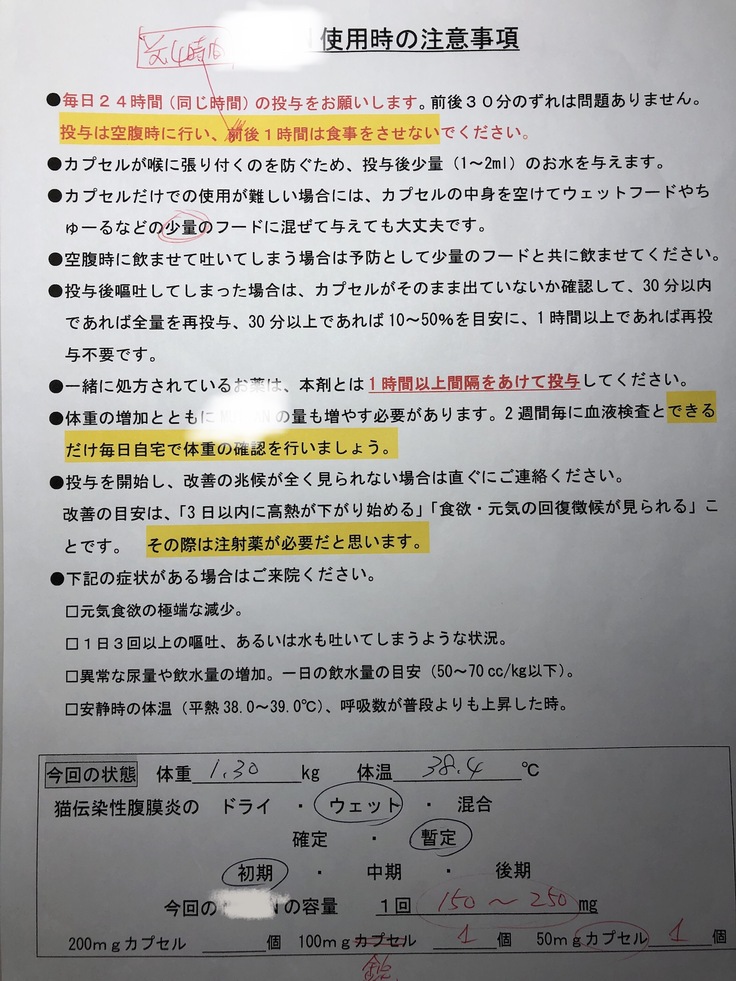 早速、藁にも縋る思いでメールで連絡をとったところ、獣医さんからの早急な返信をいただき、翌日の10月18日に診察予約が取れました。この時はまだ治療を決断できなくて、セカンドオピニオンとして改めてFIPの検査と国内未承認薬の詳細な説明を聞くために予約しました。