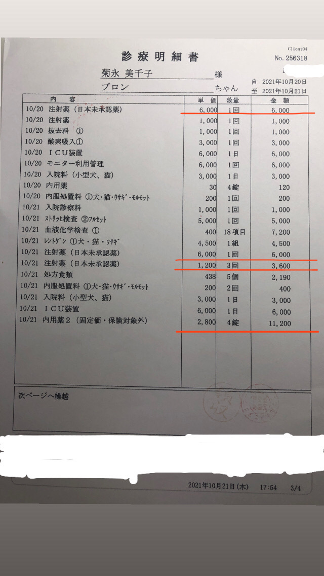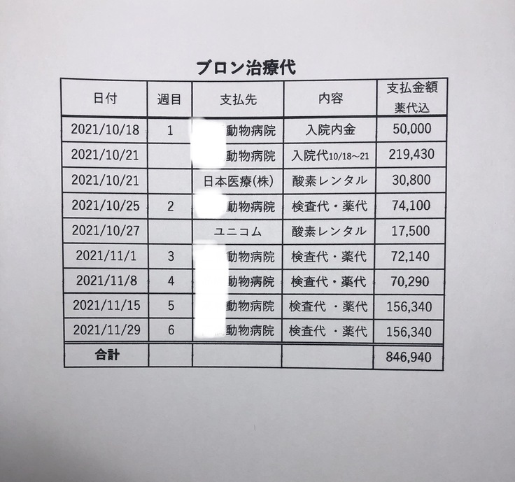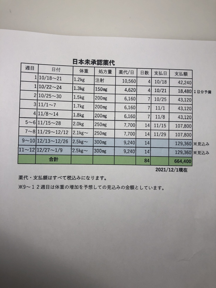 プロジェクトに必要な金額は投薬代に使用させていただきます。投薬代は10/18〜1/9までに664,400円必要になります。