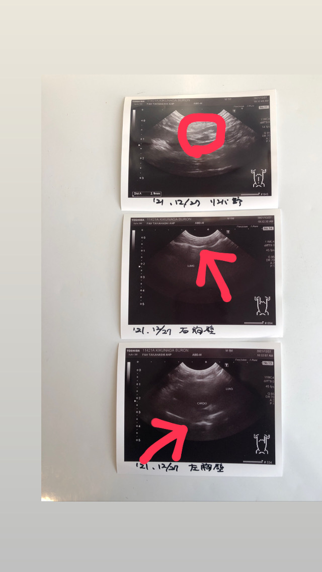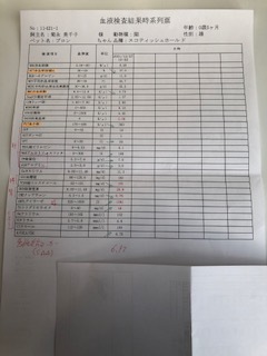 胸水、腹水は貯まっていなかったため、血液採取での検査となりました。外部依頼のため、結果は次回の時になります。