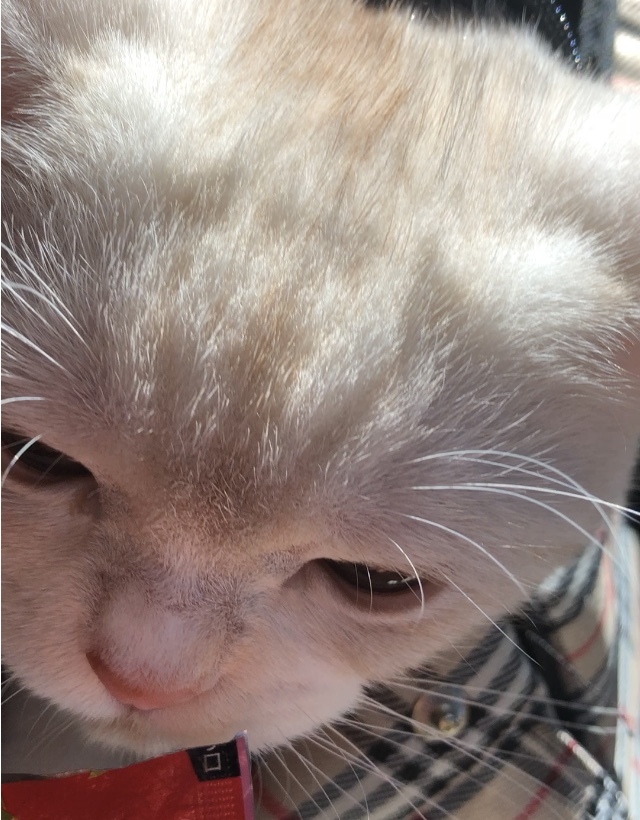 帰りの車中、ご褒美のチュールにしゃぶりついているところです。