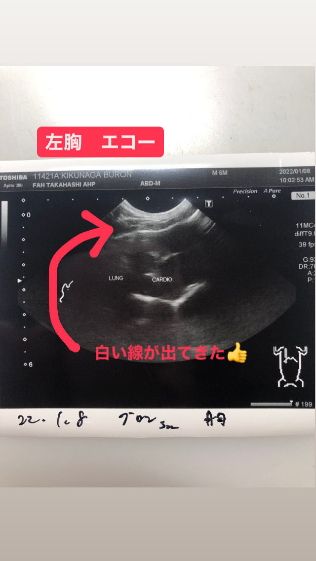 左胸の上部に白い線が出てきたのは良い。胸水貯留はなし。