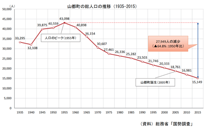 山都町は、1955年をピークに人口減少が続いています。