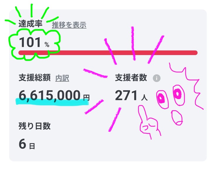 支援者さまがまだ増えていらっしゃって、達成率も上がっていました!!