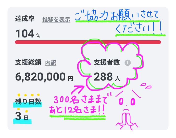木曜日まで、何とかあと12名さま以上のご支援者さまがいらっしゃったら、、、!!
