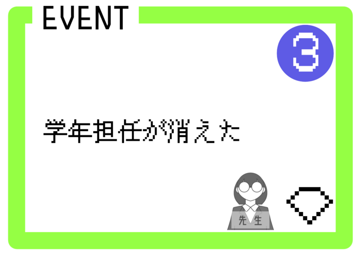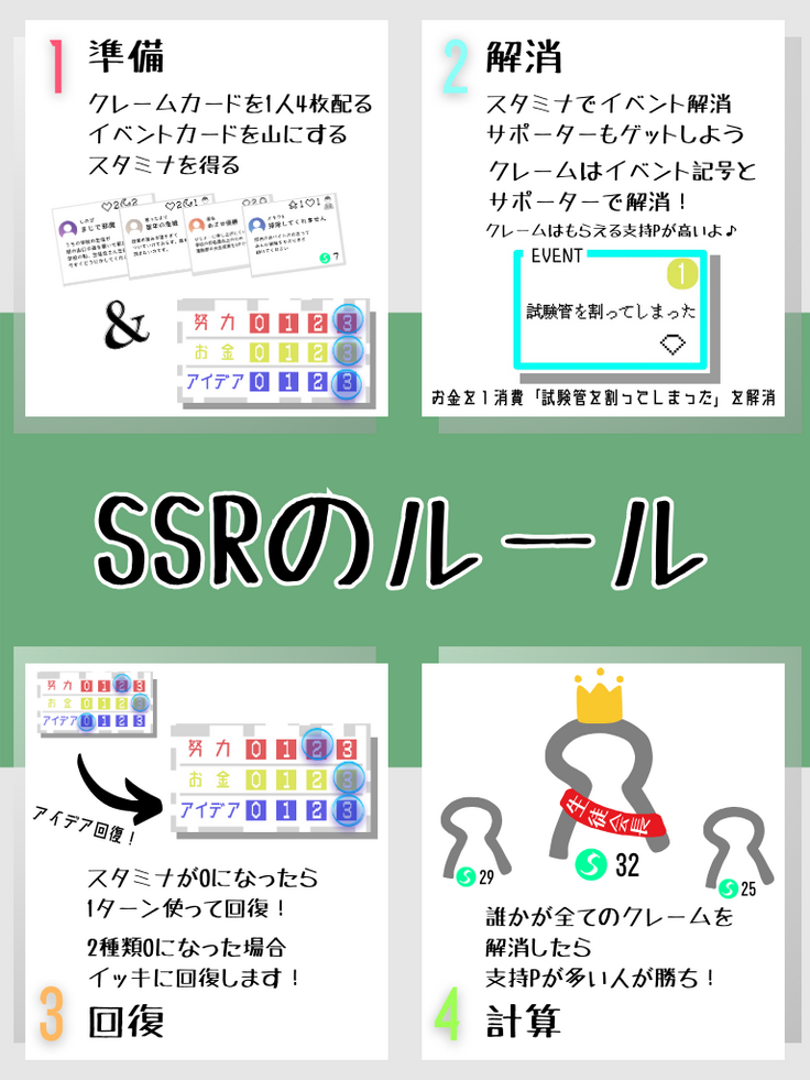 スタミナ(努力、お金、アイデア)を使って「イベント」を、その記号と数で「クレーム」を解消できます。イベントやクレームを解消して生徒からの支持を一番集めた人が勝ち!でもスタミナは3つずつしかありません。0になったら一回休みです。さぁ、あなたは改革を無事に遂げ、生徒会長になることができるのでしょうか?