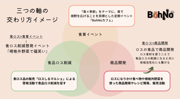 BohNoには、食育・食品ロス削減・商品開発の3つの活動の軸があります。