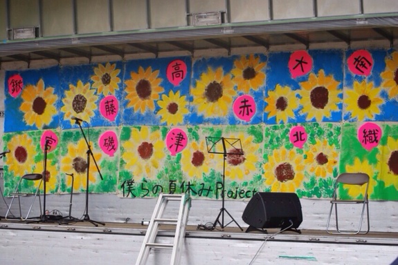 トラックステージの後ろには、小学校の交流企画で子どもたちが「手形スタンプ」で作り上げた「ひまわり畑」の旗を飾りました。
