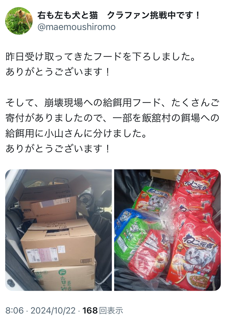 飯舘村の給餌で使ってもらえるように分けさせてもらいました。
