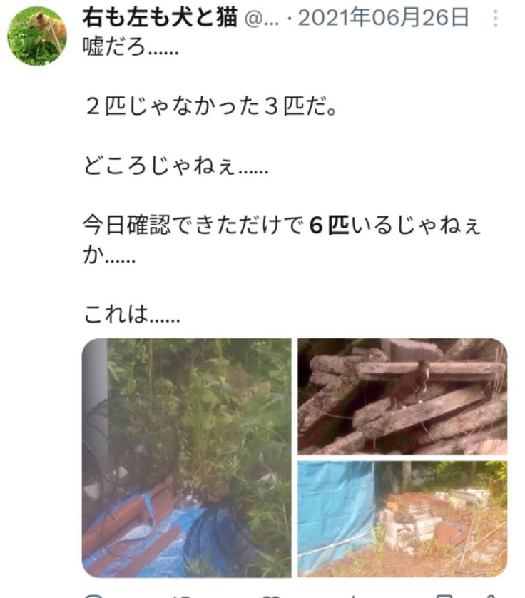 当時ヤギも一頭いて、ヤギは渡邉の知人が迎えてくれる事になりましたが、知らない人には近付いて来ない猫達は行き場を用意することができず、給餌ボランティアがご飯を運ぶ事になりました。