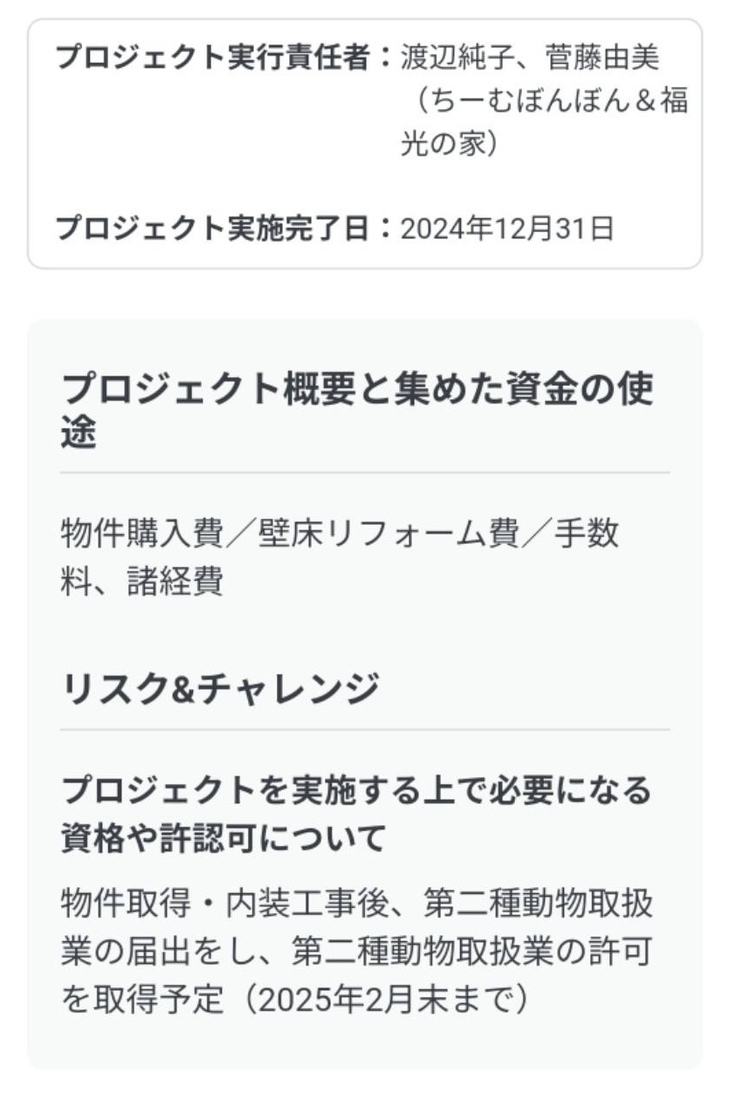 プロジェクトページにも記載してありますように、プロジェクト開始当初、2024年12月31日までに物件の購入と登記簿謄本の名義変更を完了の予定でおりましたが、まだ実行できておりません。