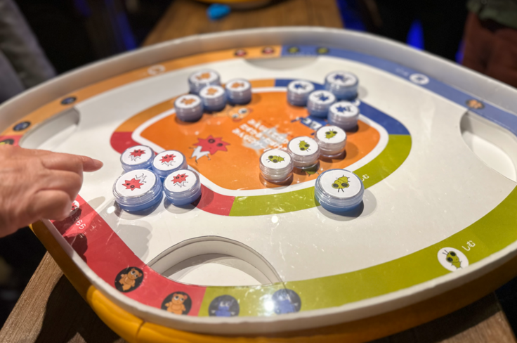 野口氏がボードゲームの遊び方を解説している風景の写真です。スマホゲームやテレビゲームにない「物質性」を表現したボードゲームで、身体全体を使う、不条理など解説しています。今回の下記の二つの試作品を体験していただきました。この二つのボードゲームはいろいろな面で違います。今後もワークショップ等のイベントを行っていきます。ボードゲームの違いを実際体験してみてください。次回開催するイベントもこの活動報告で告知していきます。全国でイベントを開催したいのですが、開発した試作品のボードゲームは手作りで壊れやすく、なかなか全国でのイベントを展開するのが難しい状況です。量産が可能になった暁には全国規模のイベントを開催したいと思っております。
