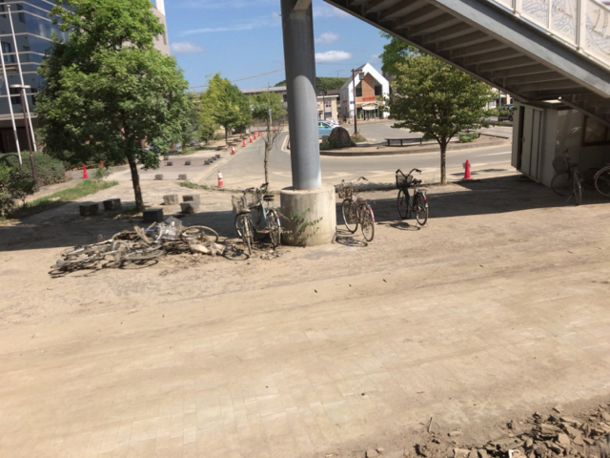 一番印象的だったのは、家財道具や瓦礫の多さです。バスの車窓から見えた手付かずの山は1km近くも続いており、被害の大きさを表していました(写真3, 4)。また、歩道の端に木材が積んであるところや、自転車が泥だらけのまま放置されている(写真2)のを見て、辛くなりました。少しでも早く被災地の方々が日常に戻れるように尽力したいと思いました。