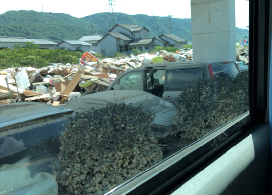 3.バスの車窓から見た真備町の様子。車も泥だらけになっている。